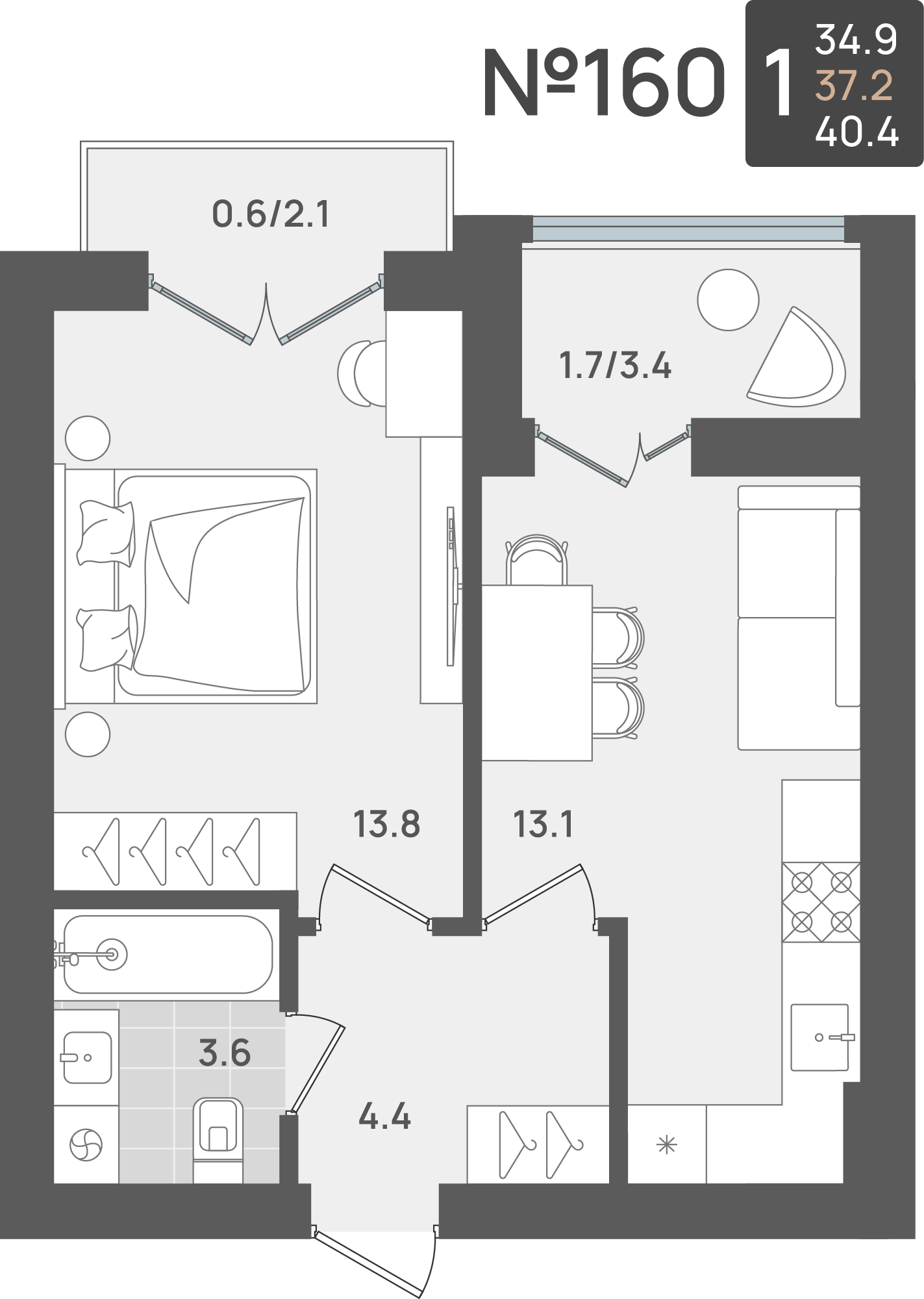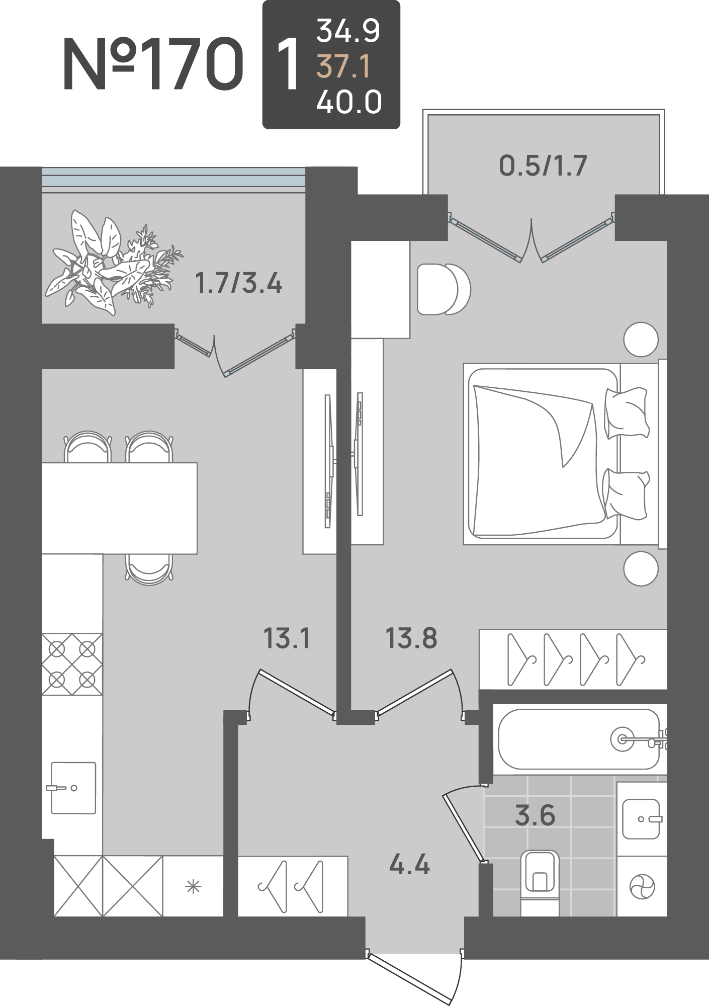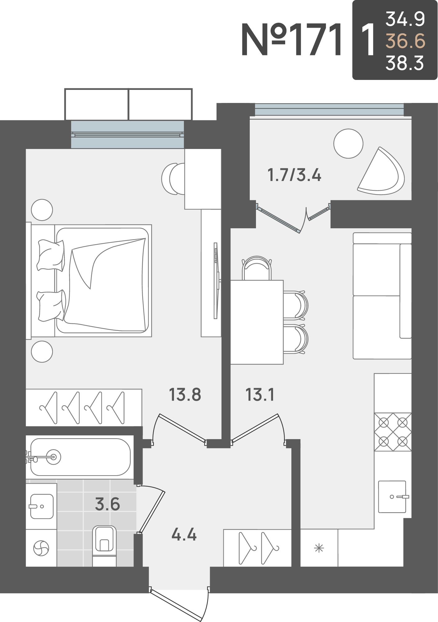 - Жилая площадь - 34.70 м²