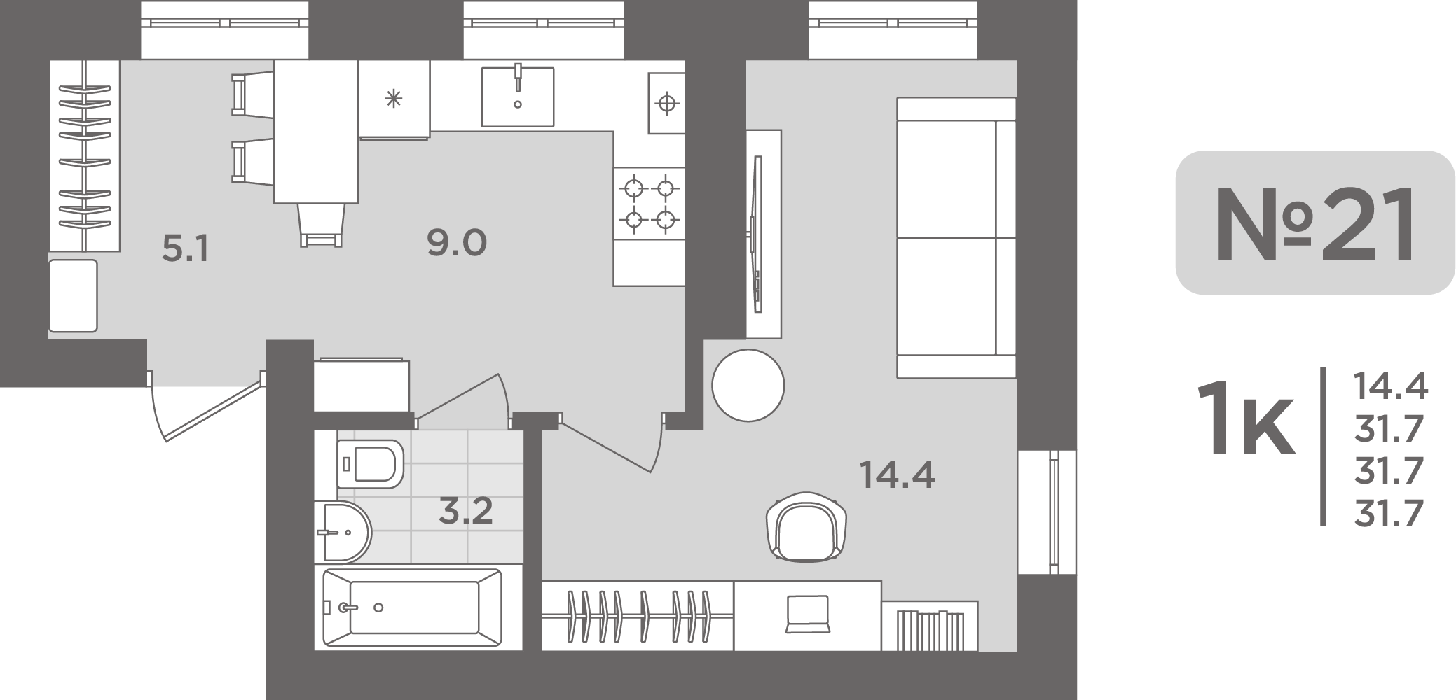 - Жилая площадь - 19.70 м²